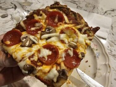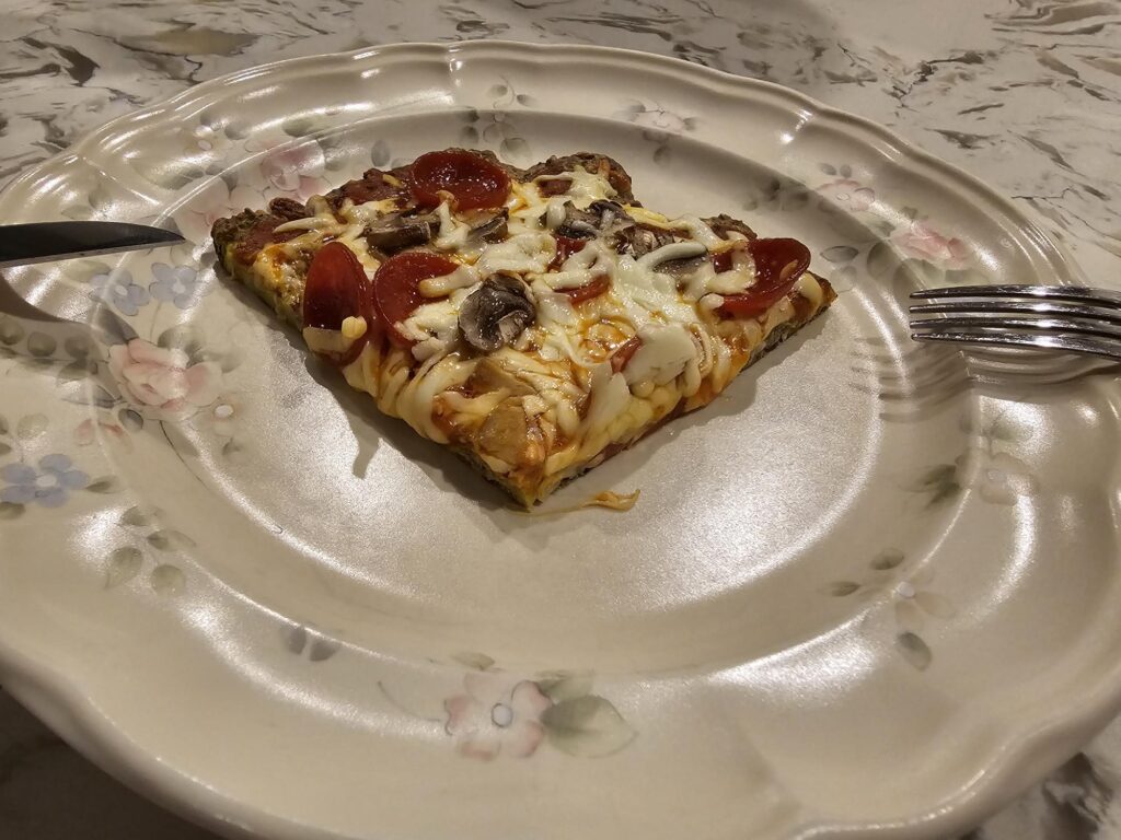 I cut the finished pizza into six slices. The first slice I ate with a knife and fork, and it held together beautifully—light, flavorful, and much less dense than other keto crusts I’ve made with parmesan, flaxseed, or almond flour. The second slice I ate warm, holding it in my hand. As long as I supported it with my fingers, it stayed intact. The third slice I tried after it cooled more, and while it still held together, it didn’t firm up any further. Lesson learned: this crust is best enjoyed hot.